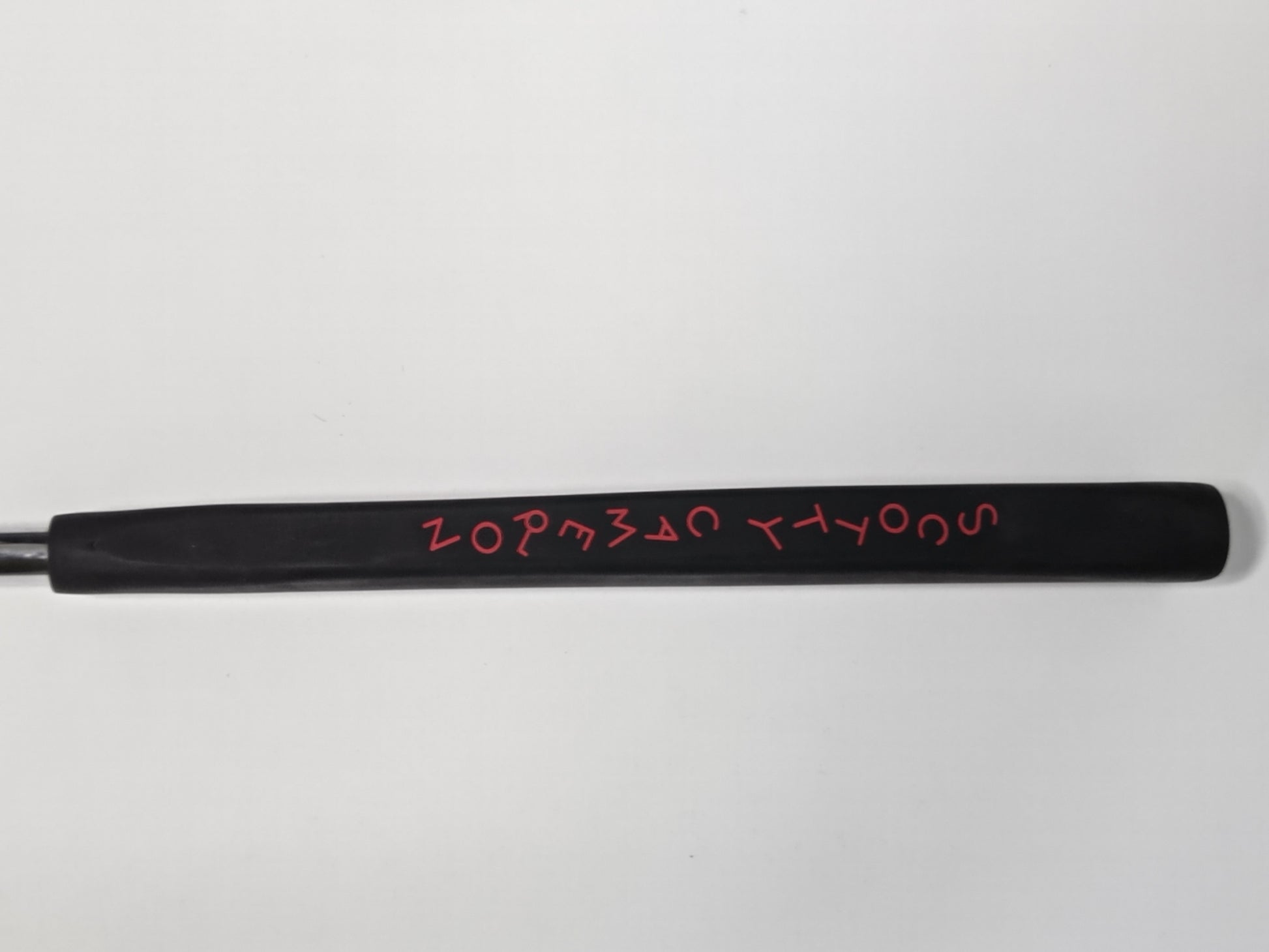 アリゾナの工房に特注した、日本国内ではほぼ製造不可能なスコッティキャメロン カスタムパターです。バックバンブとソールウェイトに実弾のリム部を埋め込み、ブラックPVD加工を施した上にレーザーマーカーでカモフラージュ柄のエッチングをかけています。さらには文字を金色と赤色にペイントした破壊力抜群のパターです。情報量が多いですが、一目見ただけで吸い込まれる圧倒的存在感のあるカスタムデザインです。