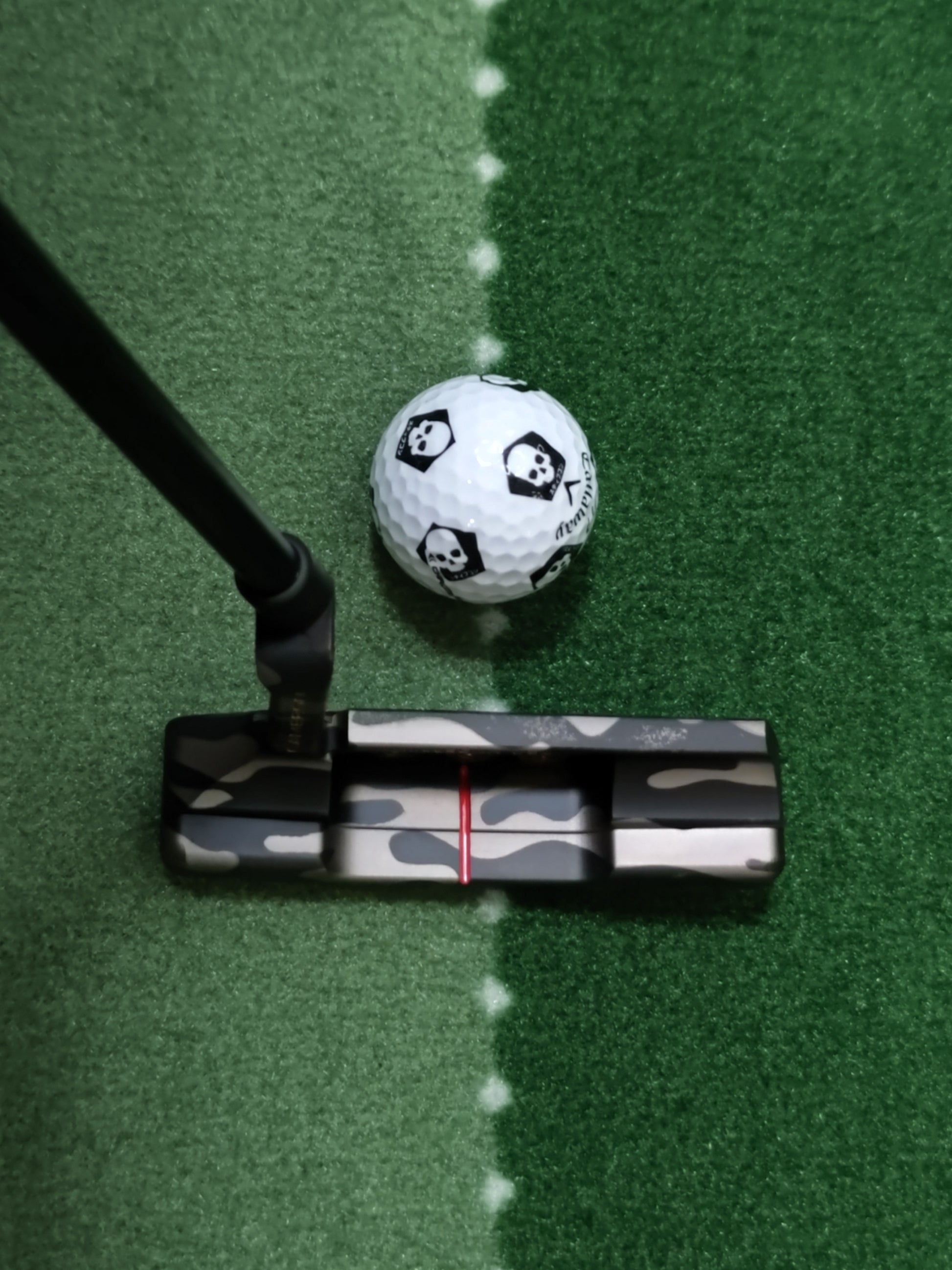 アリゾナの工房に特注した、日本国内ではほぼ製造不可能なスコッティキャメロン カスタムパターです。バックバンブとソールウェイトに実弾のリム部を埋め込み、ブラックPVD加工を施した上にレーザーマーカーでカモフラージュ柄のエッチングをかけています。さらには文字を金色と赤色にペイントした破壊力抜群のパターです。情報量が多いですが、一目見ただけで吸い込まれる圧倒的存在感のあるカスタムデザインです。