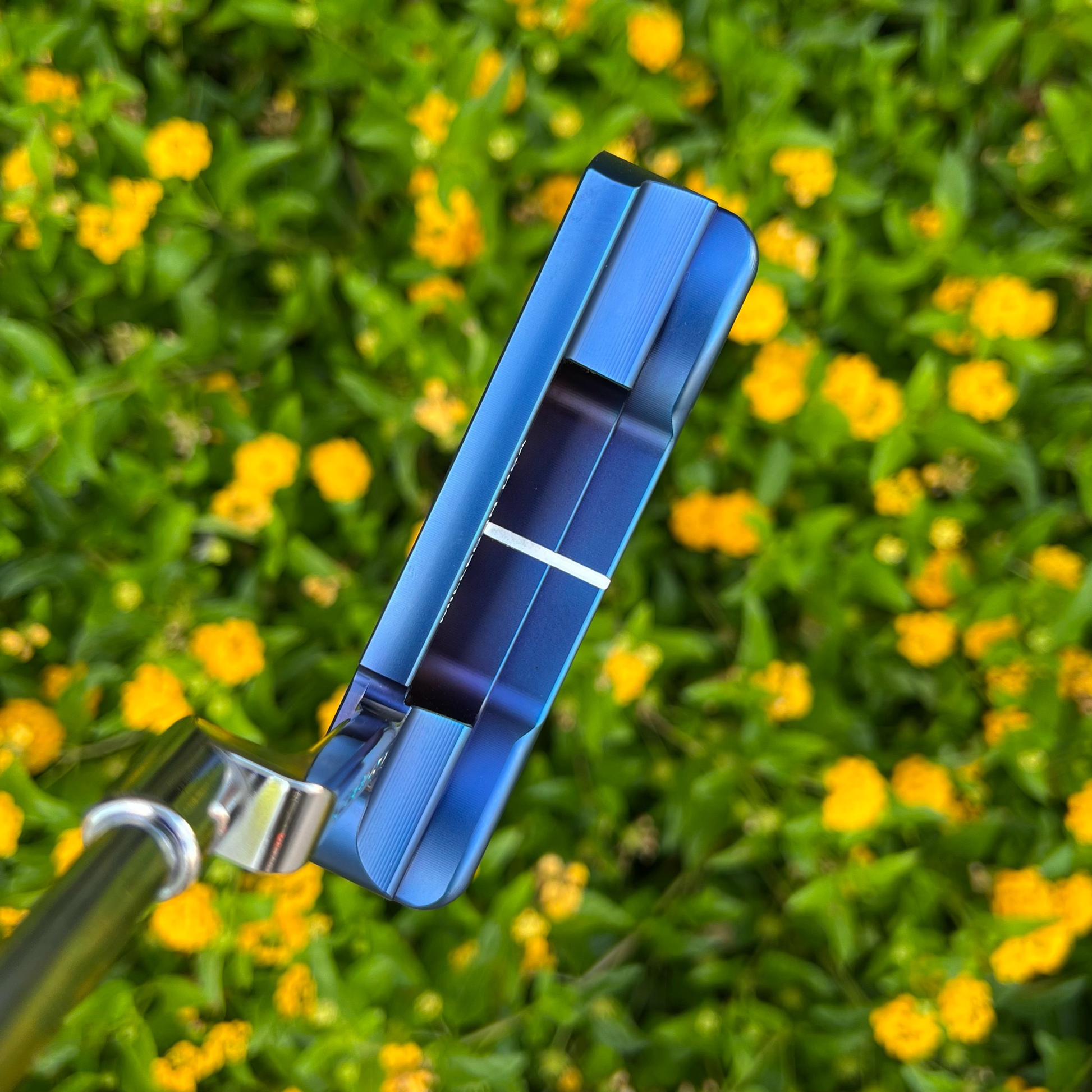 アリゾナの工房に特注した、日本国内ではほぼ製造不可能なスコッティキャメロン カスタムパターです。バックバンブ及びソールウエイトに実弾のリム部を埋め込み、ヘッドにはブルーPVD加工とネックにはクロム加工を施し、文字を白色に書き換えた破壊力抜群のパターです。