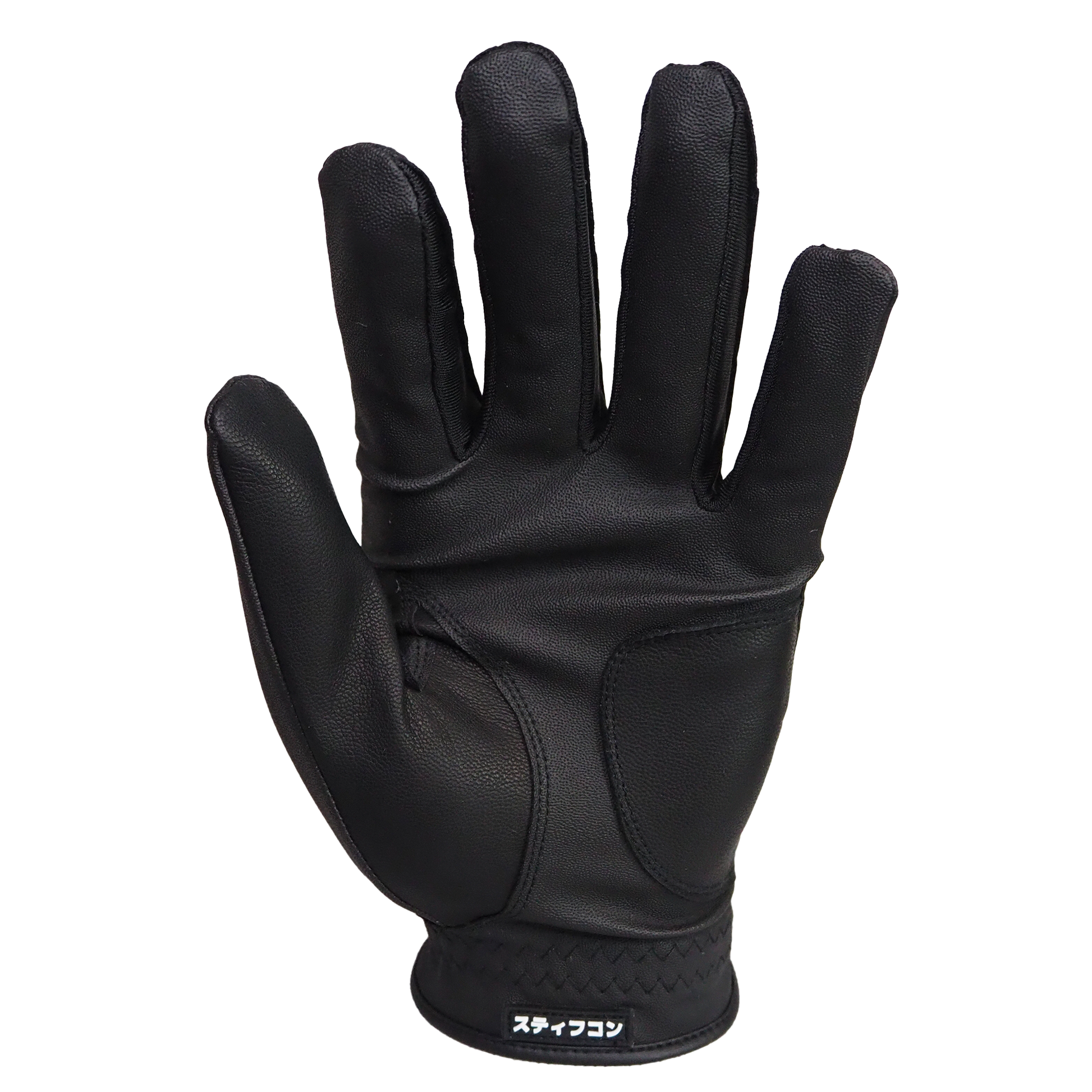 背面にリアルレザーの質感に近いSARINA合成皮革を用い、弾頭を意識した鮫柄と拳部分には尖ったフォントでGOLFをプリントし、パーム側には合成皮革をメインに親指と補強パッチ部に高級天然皮革カブレッタレザーを使用しています。また、伸縮性に優れたスパンデックス素材を一部に使用し、指や手の肉厚差にも対応できるようにしております。