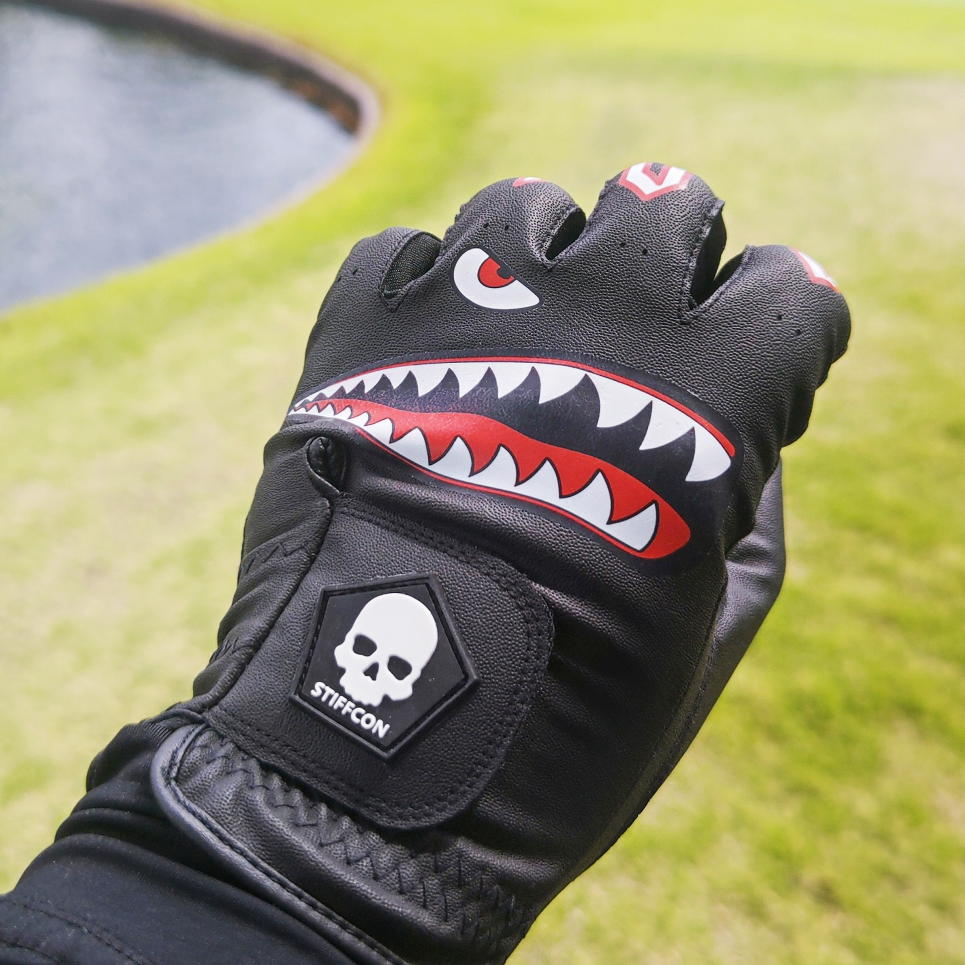 色で攻めるゴルフグローブFLUO/フルオシリーズから爆発力のあるサメ柄JAWBREAKERが登場。フルオブラックをベースにフライングタイガースの系譜に連なるサメ柄をプリントした手元から強く主張するデザインのゴルフグローブです。