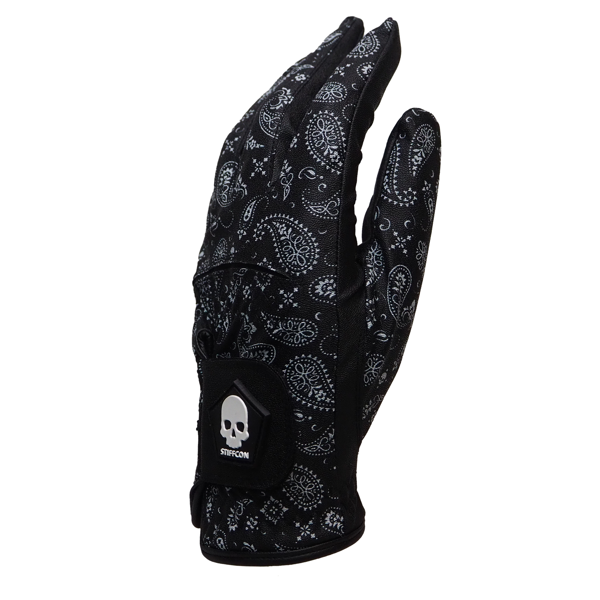 色で攻めるゴルフグローブFLUO/フルオシリーズからペイズリースカル柄が再登場。フルオブラックをベースに大胆なペイズリー柄とブランドロゴのスカルを小さくをプリントした黒のコーディネイトに溶け込むデザインのゴルフグローブです。
