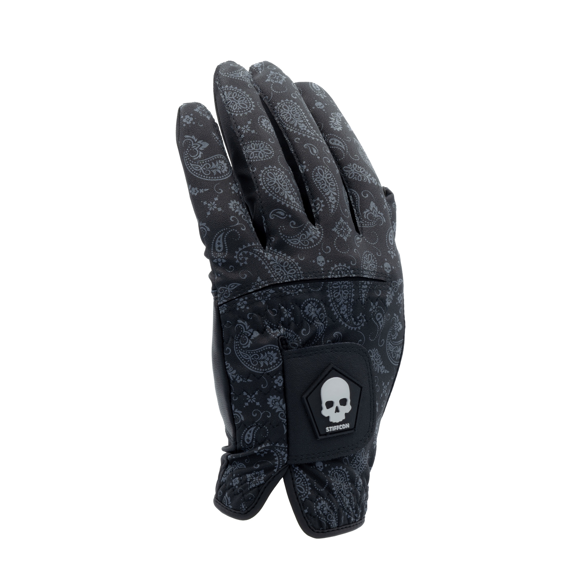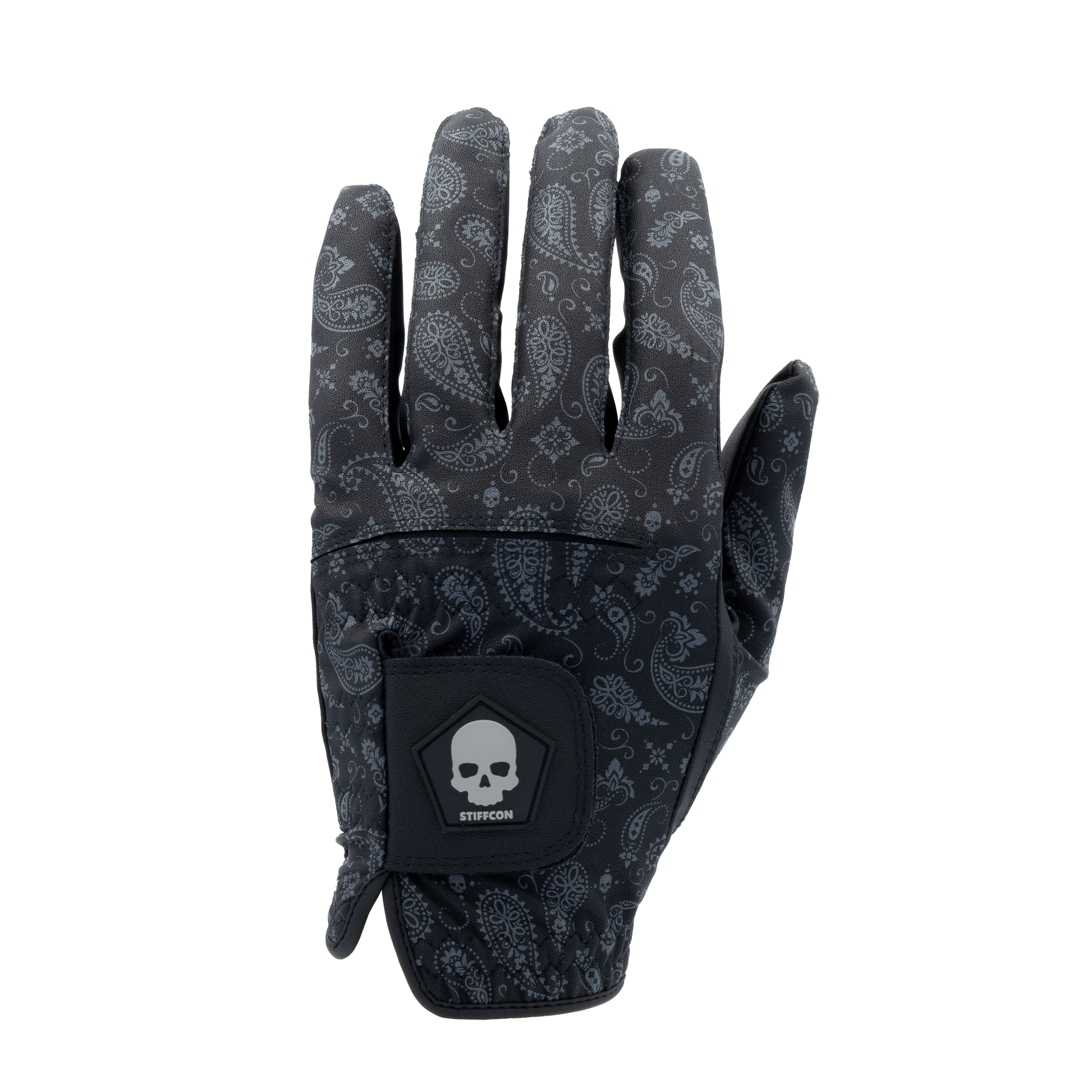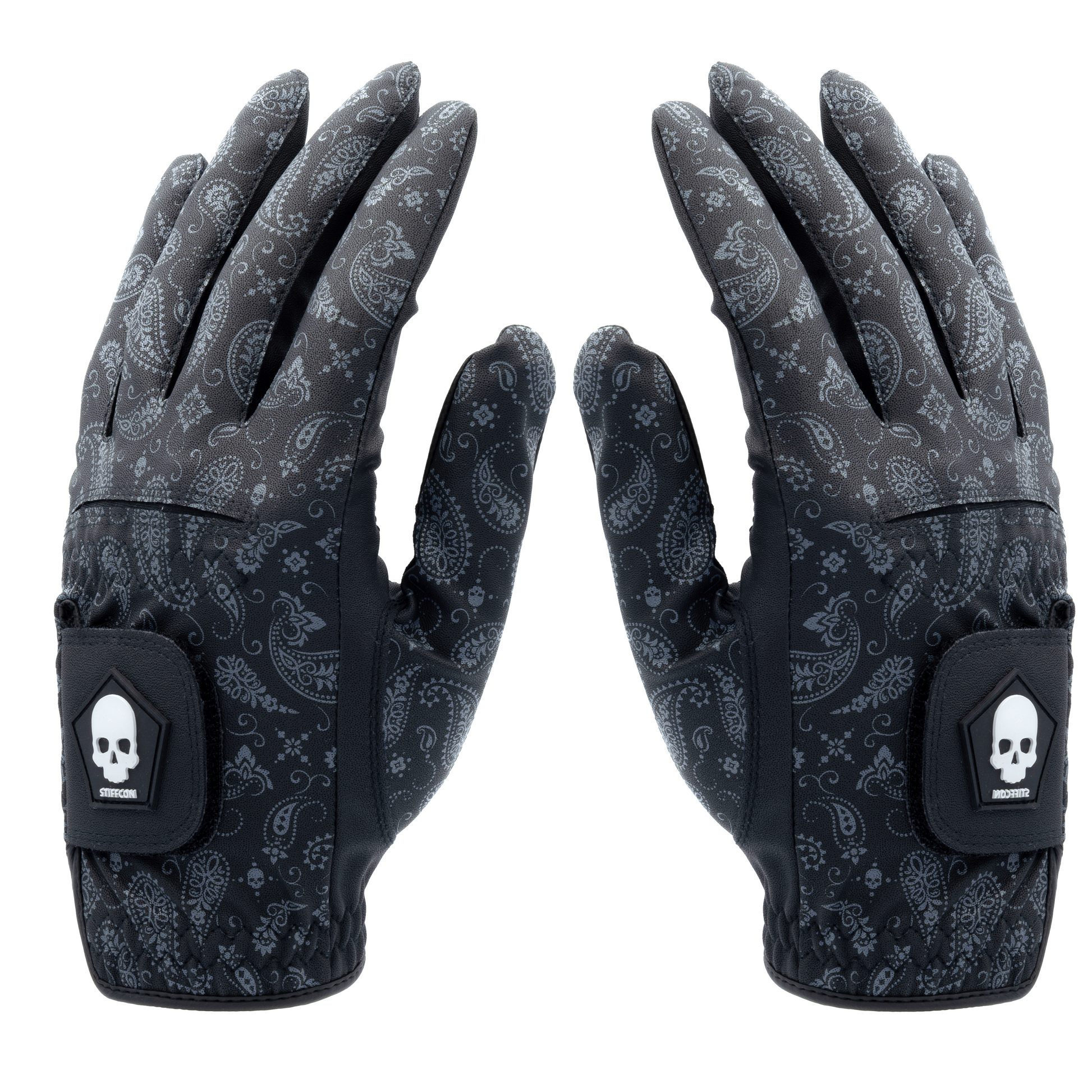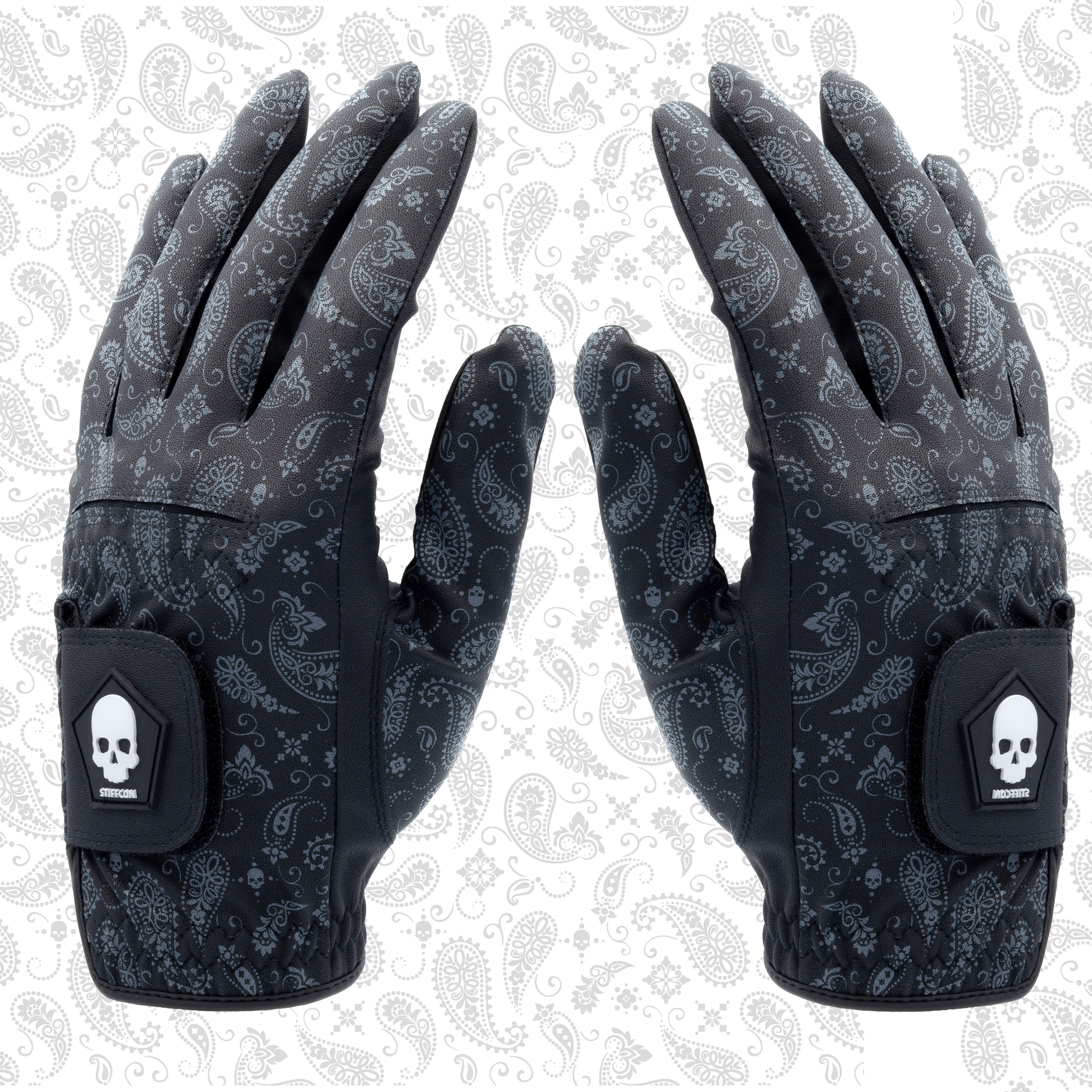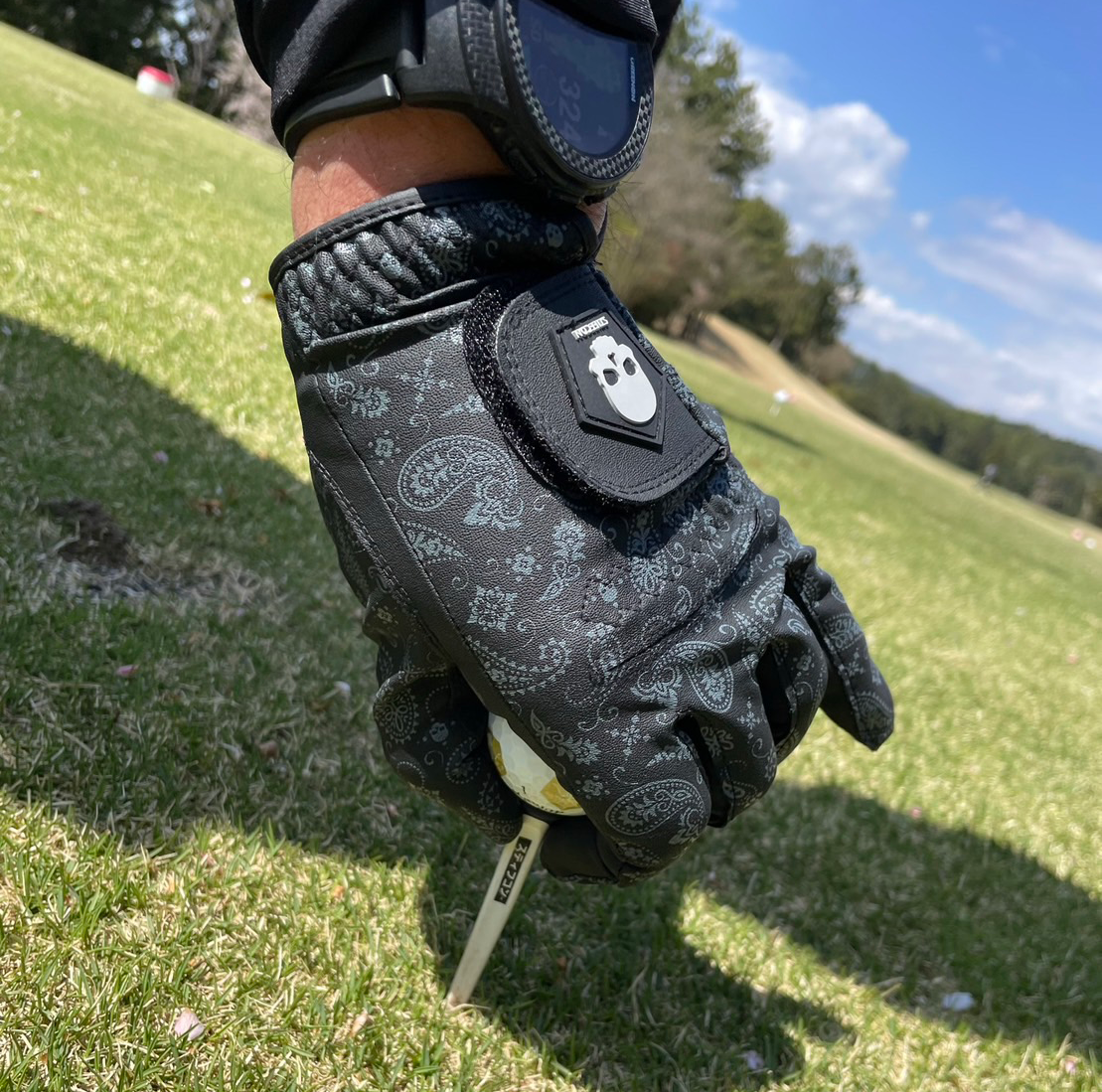 色で攻めるゴルフグローブFLUO/フルオシリーズからペイズリースカル柄がレディース両手バージョン登場。フルオブラックをベースに大胆なペイズリー柄とブランドロゴのスカルを小さくをプリントした黒のコーディネイトに溶け込むデザインのゴルフグローブです。