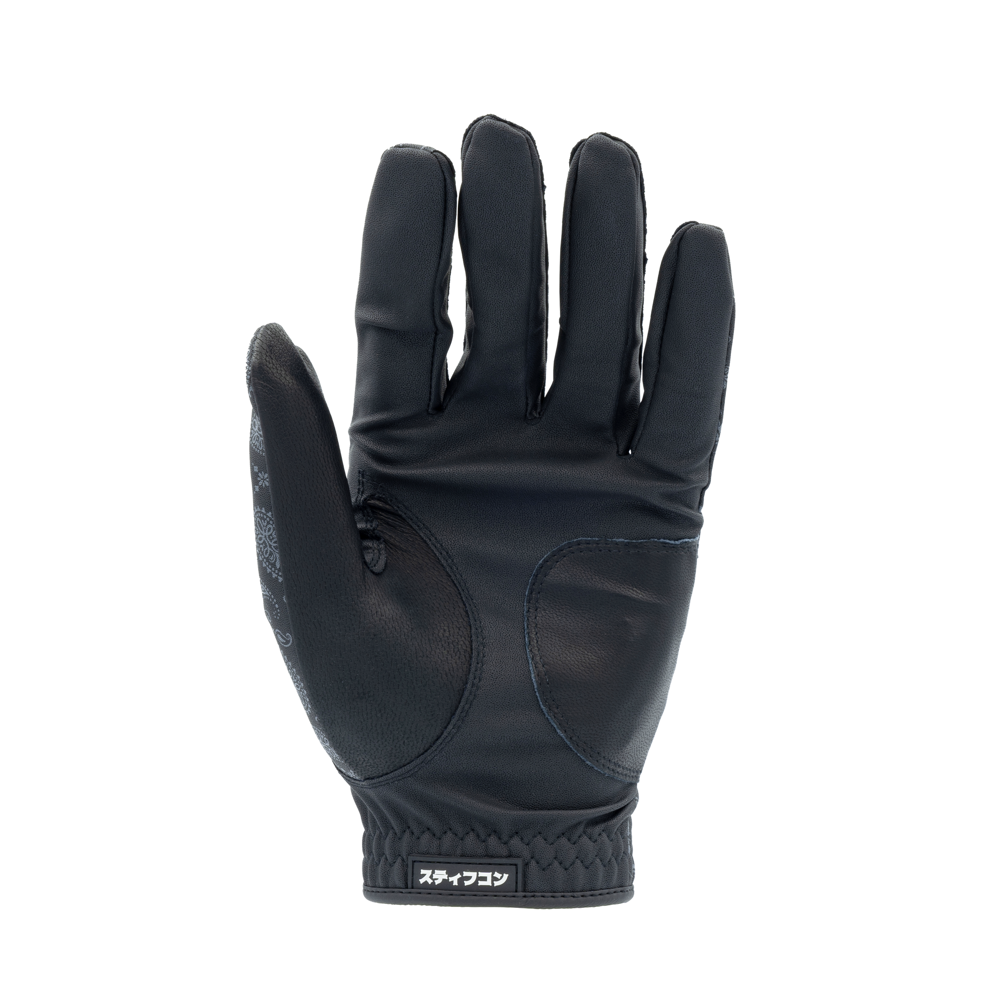 背面にレザーの質感に近いRX70合成皮革を用いペイズリースカル柄をプリントし、パーム側には合成皮革をメインに親指と補強パッチ部に高級天然皮革カブレッタレザーを使用しています。また、伸縮性に優れたスパンデックス素材を一部に使用し、手の肉厚差にも対応できるようにしております。
