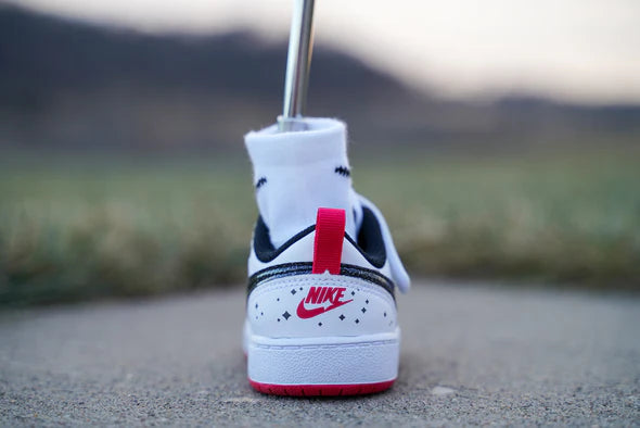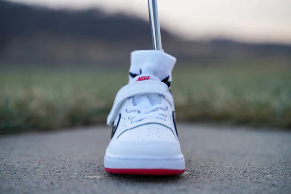 某有名スポーツメーカーのキッズシューズをベースにハンドメイドで加工を施し、使い勝手を高めたパターカバーです。快適にご利用いただくために、隠れたアイデアを盛り込んでいます。