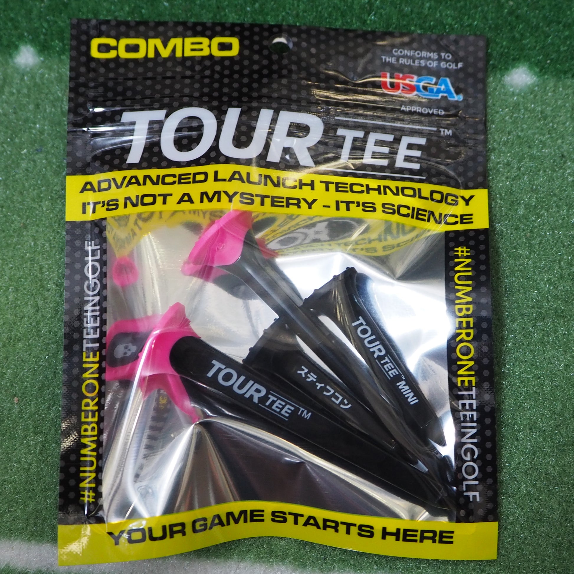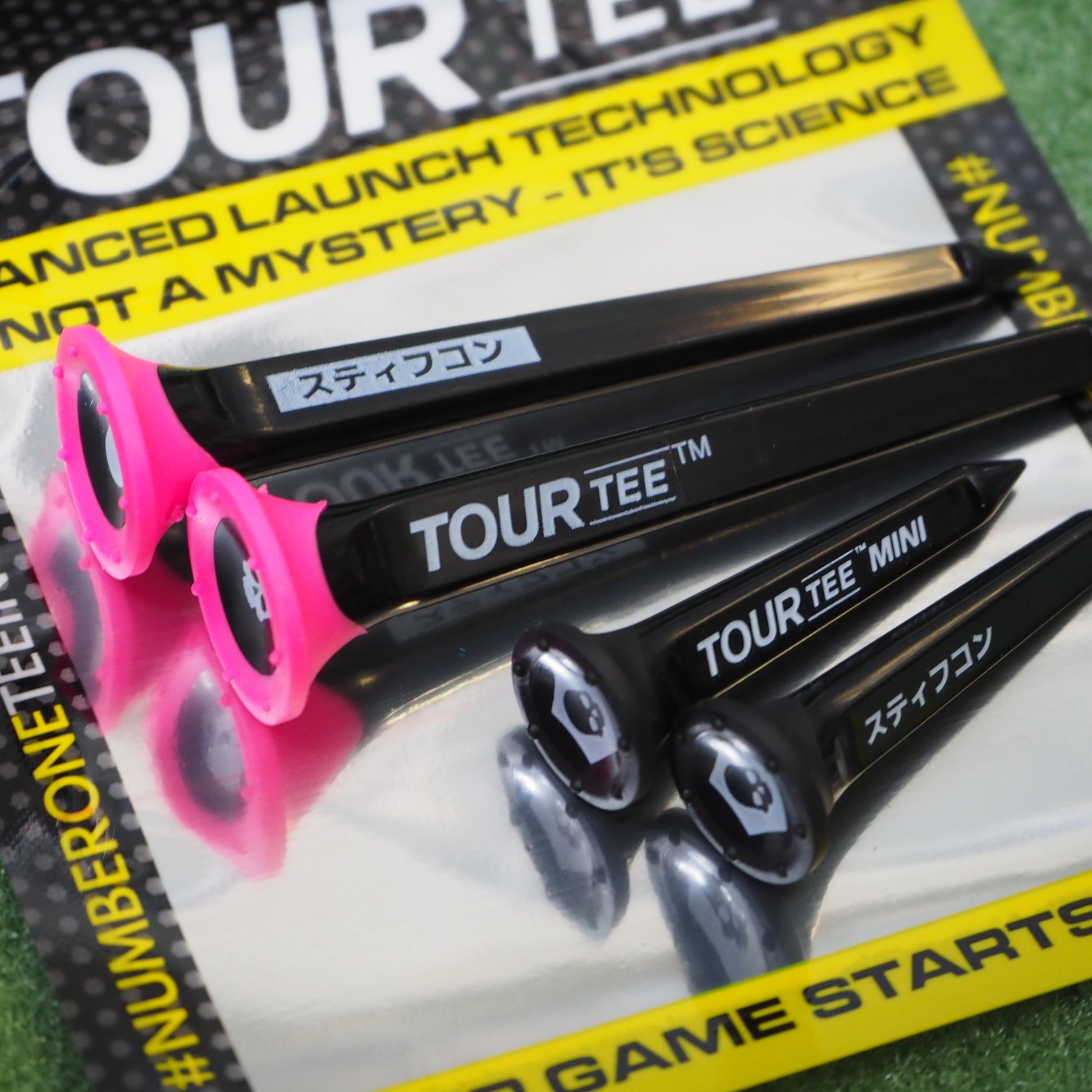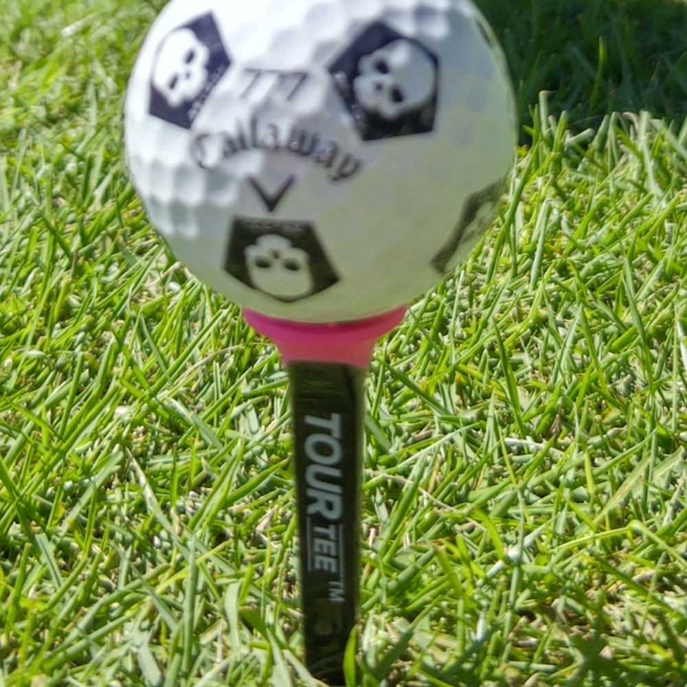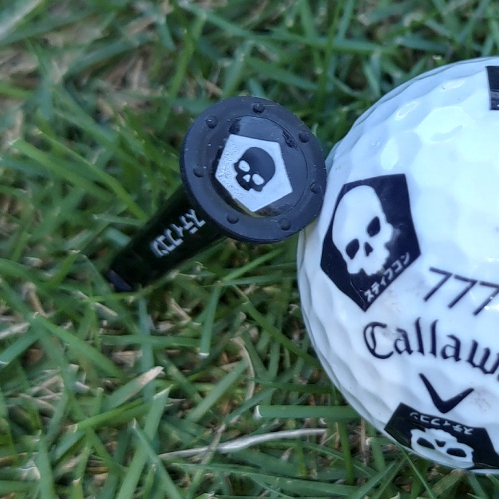 上部のカップ型ラバー内にはブランドロゴのペンタスカル。側面にはカタカナ表記のスティフコンとTOUR TEEロゴ。上部カップは大型でボールの座りが非常に良いです。ピンク色のカップをロングティーには採用し、ティーイングエリアで目立つカラーリングに。シートティーはブラックに黒色に統一しました。貴殿の秘めたる力を解き放ち、集中力を極限まで高めるようデザインされております。