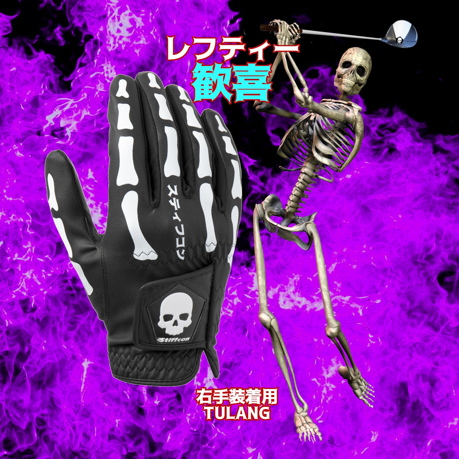 TULANG/トゥーランはグローブ全面に大胆な骨柄をプリントした強烈なインパクトを持つ私たちSTIFFCON/スティフコンのファーストプロダクトです。ティーイングエリアの圧倒的な存在感、クラブを握った瞬間の高揚感は格別です。ゴルフグローブの世界最大級の生産地であるインドネシアの提携工場と試作を重ね、ようやく商品化に至りました。このTULANGという言葉はインドネシア語で骨を意味し、試作品の開発コードネームにもなっています。製品化に尽力していただいたインドネシアのスタッフに敬意を込め、そのまま商品名に採用いたしました。