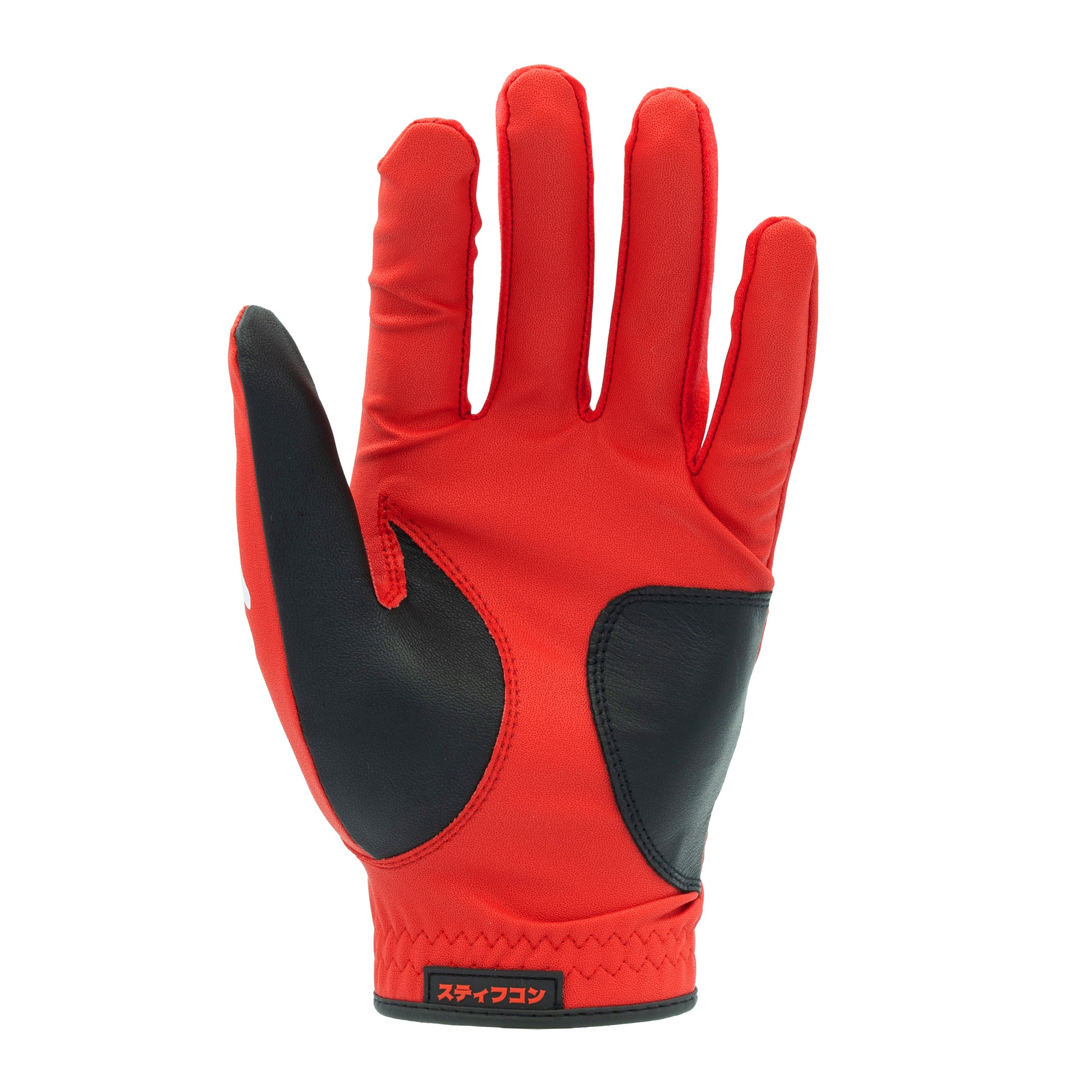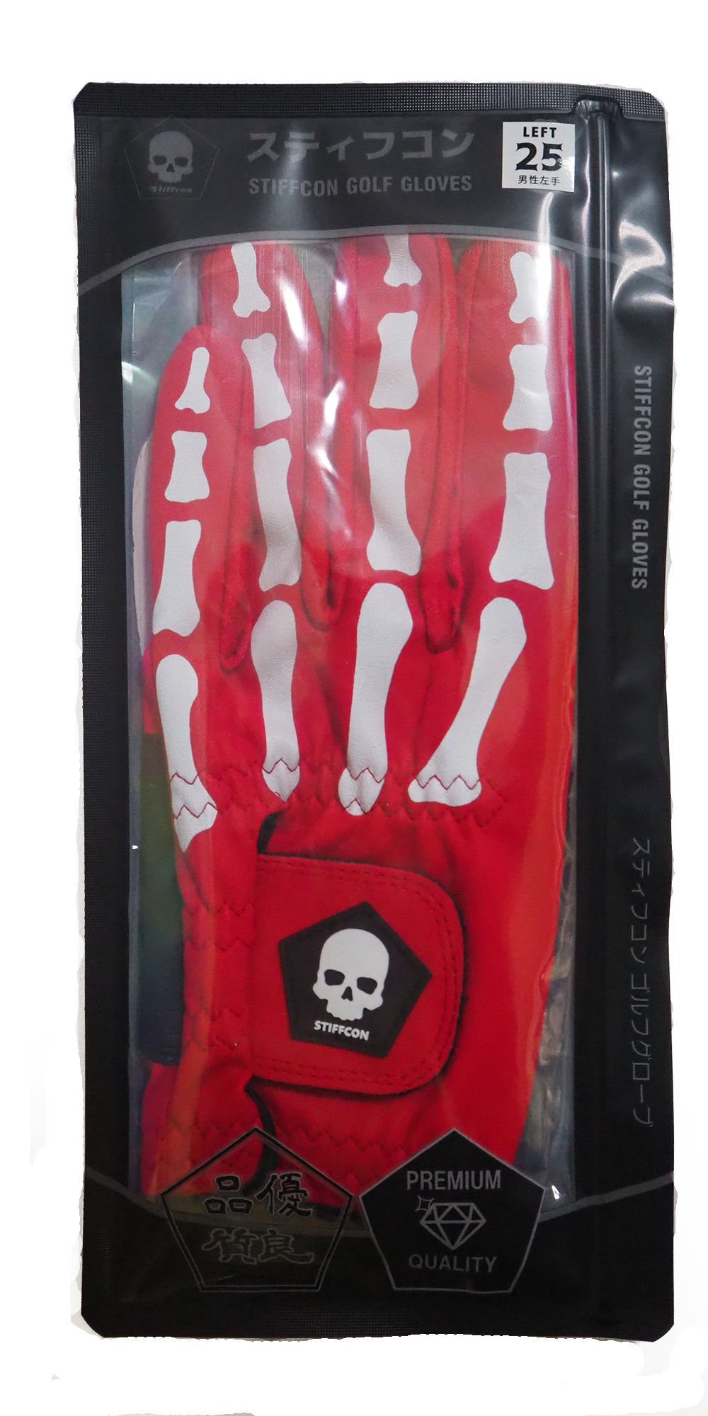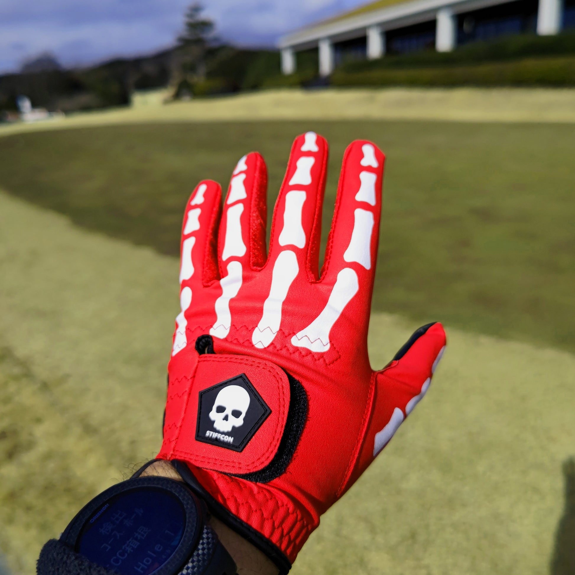 圧倒的存在感を標榜するTULANGゴルフグローブシリーズに限定バージョンが登場。ティーイングエリアの圧倒的な存在感、クラブを握った瞬間の高揚感を演出するゴルフグローブです。赤ベースの合成皮革に白の骨柄がプリントされており、繊細な感覚を損なわないようグリップと密接する親指部分にはカブレッタレザーを採用しております。